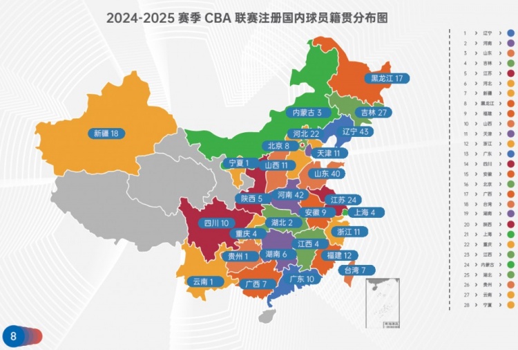 據(jù)統(tǒng)計(jì),本賽季CBA注冊(cè)本土球員籍貫分布中,遼寧(43人)、河南(42人)、山東(40人)仍然斷檔領(lǐng)先。
