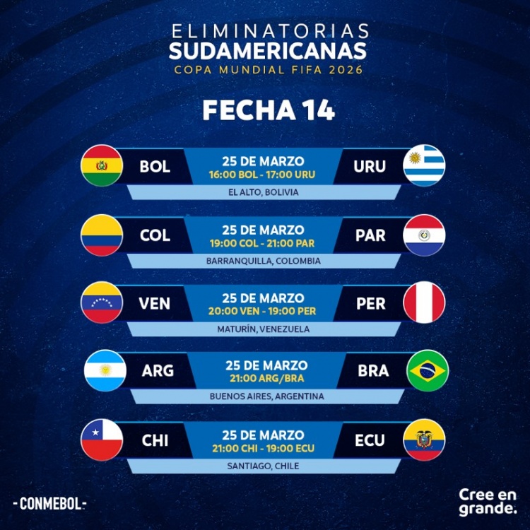 2月1日訊 南美足聯(lián)曬出了第13輪、第14輪世預(yù)賽的開球時間,3月22日7點30分烏拉圭vs阿根廷、3月26日8點阿根廷vs巴西。