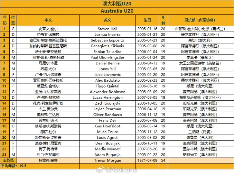 國青戰(zhàn)澳大利亞U20的23人名單如下: