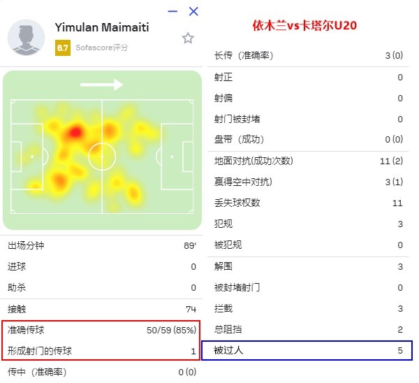 依木蘭最被球迷津津樂道的一幕,就是發(fā)生在跟卡塔爾U20的比賽里。當(dāng)時(shí)依木蘭用一個(gè)布斯克茨式轉(zhuǎn)身完成變向,隨后送出直塞球給到隊(duì)友陳澤仕,帶來了隨后的反擊機(jī)會(huì)。