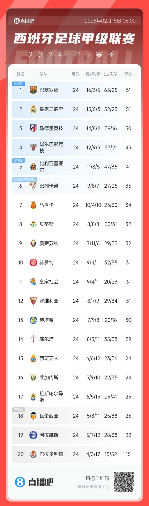 2月18日訊 西甲第24輪,巴塞羅那1-0小勝巴列卡諾,重回西甲榜首,憑借凈勝球優(yōu)勢力壓皇馬。