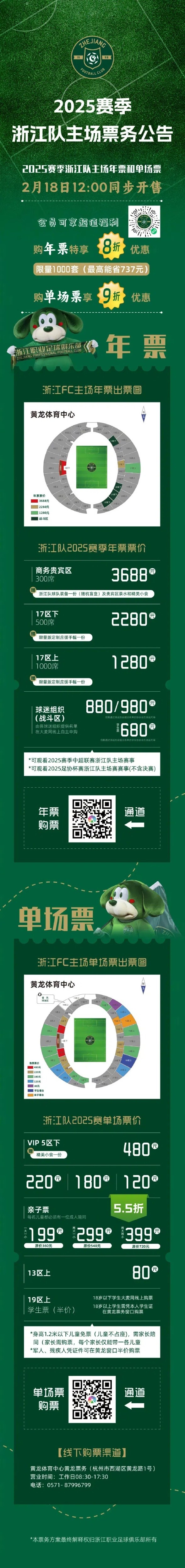 2月18日訊 浙江隊(duì)官方公布了2025賽季主場年票和單場球票的票務(wù)方案,2月18日12:00將同步開售。