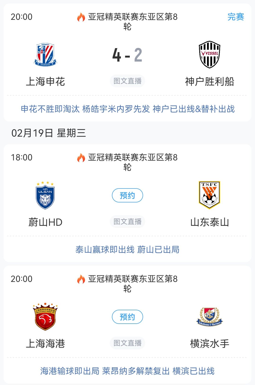 泰山和海港都將在明天出戰(zhàn),泰山只要不輸球就能拿到晉級名額,而海港需要3分才能升入晉級區(qū)。而只要泰山輸球或海港不勝,申花就能晉級到淘汰賽階段。