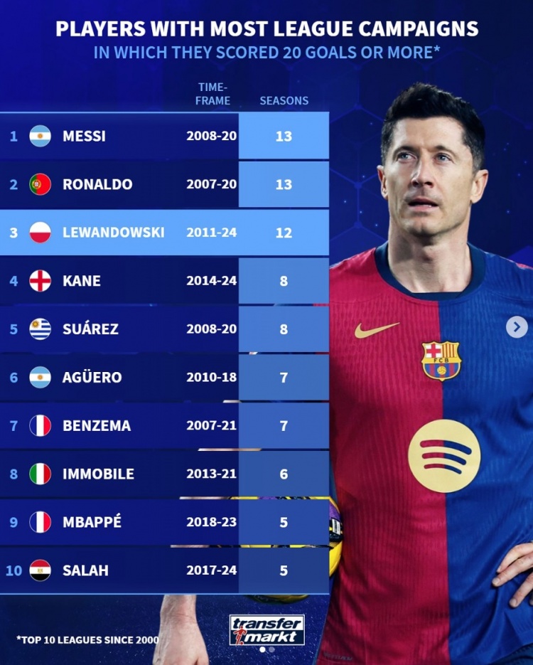 2月19日訊 萊萬在昨日西甲打進(jìn)制勝球幫助巴薩取勝,他也達(dá)成了本賽季聯(lián)賽20球里程碑,這也是他五大聯(lián)賽生涯第12次做到,新世紀(jì)僅次于梅西和C羅。