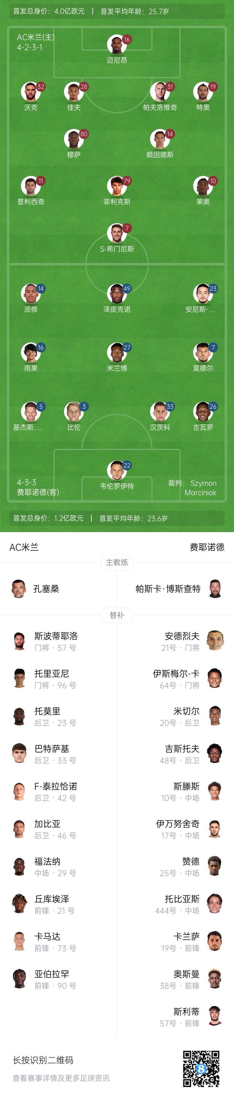 米蘭替補:57-斯波蒂耶洛、96-托里亞尼、21-丘庫埃澤、23-托莫里、29-福法納、33-巴特薩基、42-泰拉恰諾、46-加比亞、73-卡馬達、90-亞伯拉罕