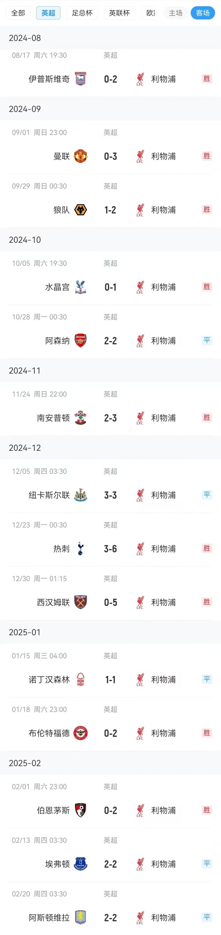 數(shù)據(jù)統(tǒng)計顯示,利物浦在本賽季共計14個英超客場比賽取得9勝,僅被5次逼平,至今保持不敗。