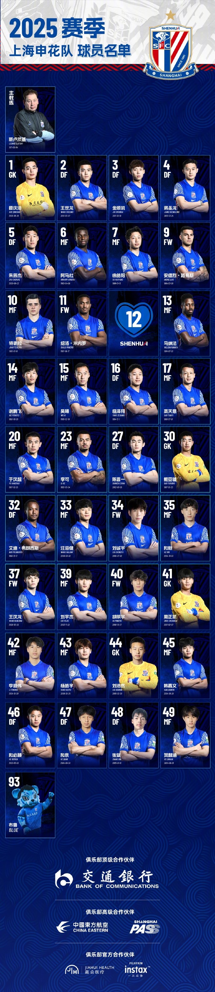 2月20日訊 上海申花官方公布了2025賽季一線隊(duì)球員名單,阿馬杜、路易斯、特謝拉、米內(nèi)羅、馬納法5名外援領(lǐng)銜,吳曦、朱辰杰、于漢超、李可、劉誠(chéng)宇等球員在列,共35名球員入選。