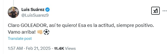 蘇亞雷斯表示道:“你當(dāng)然還是進(jìn)球的射手,我很愛(ài)你!你要永遠(yuǎn)保持積極向上的態(tài)度,繼續(xù)加油吧!??????????”