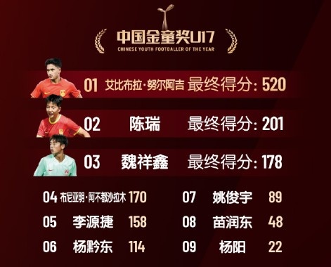 2月21日訊 足球周刊今日公布中國金球獎具體的相關(guān)得分,其中金童獎具體得分如下:
