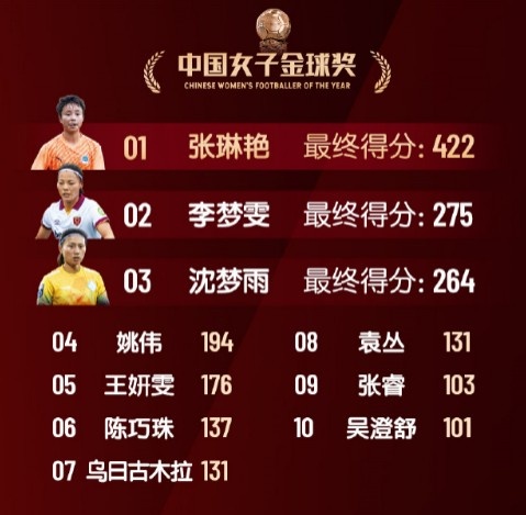 2月21日訊 《足球周刊》公布了本次中國(guó)金球獎(jiǎng)各獎(jiǎng)項(xiàng)評(píng)選具體得分,其中中國(guó)金帥獎(jiǎng)方面于根偉斷層領(lǐng)先,中國(guó)女子金球獎(jiǎng)則是張琳艷同樣較大優(yōu)勢(shì)領(lǐng)跑。