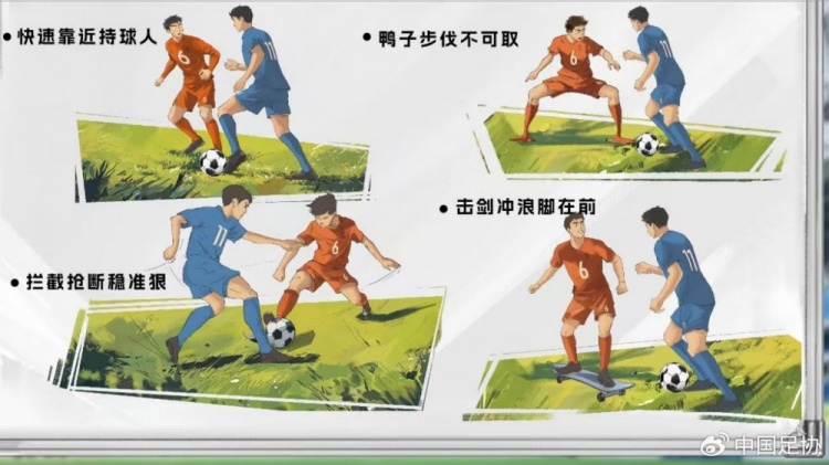為了讓隊(duì)員們更直觀理解每堂課的內(nèi)容,宗磊特意將每項(xiàng)培訓(xùn)內(nèi)容的要點(diǎn)提煉出“七字箴言”,比如針對(duì)一對(duì)一防守,他提煉的要訣為,“快速靠近持球人,攔截?fù)寯喾€(wěn)準(zhǔn)狠;鴨子步伐不可取,擊劍沖浪腳在前”。不僅如此,他還請(qǐng)人配上了漫畫(huà),讓人看了,一目了然。