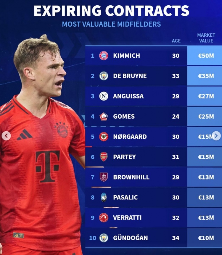 2月21日訊 《轉(zhuǎn)會市場》統(tǒng)計(jì)了合同今年到期的中場球員身價(jià)情況,基米希身價(jià)最高。