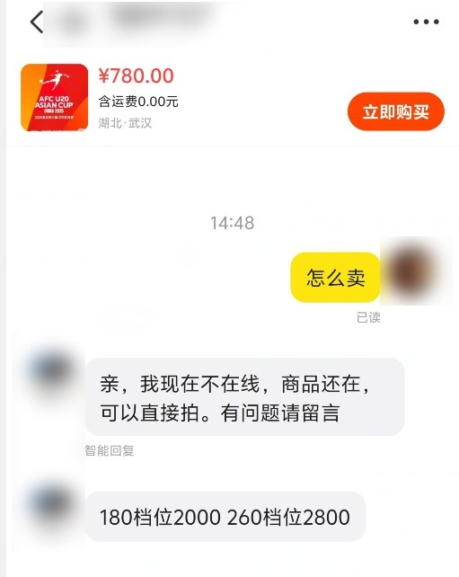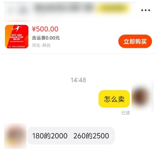 本場比賽門票開票后,1分鐘就售罄,銷售異常火爆!目前,有黃牛已經(jīng)將原價180元的門票炒至1000-2000元,其他價位的門票價格更高。