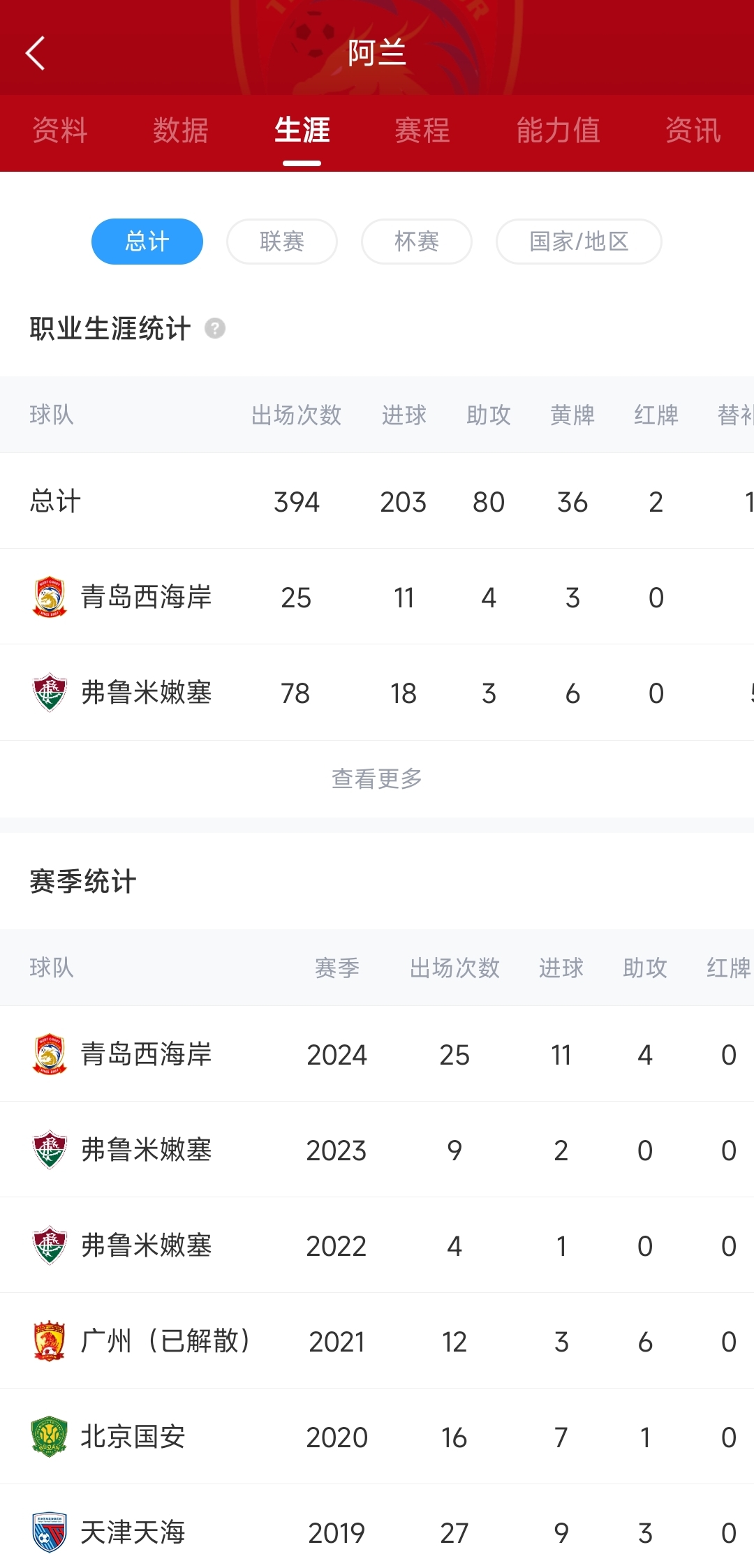 現(xiàn)年35歲的歸化前鋒阿蘭,上賽季代表青島西海岸出戰(zhàn)25場比賽,貢獻11球4助。國家隊層面,阿蘭至今代表中國男足出戰(zhàn)14場比賽,貢獻3球1助。
