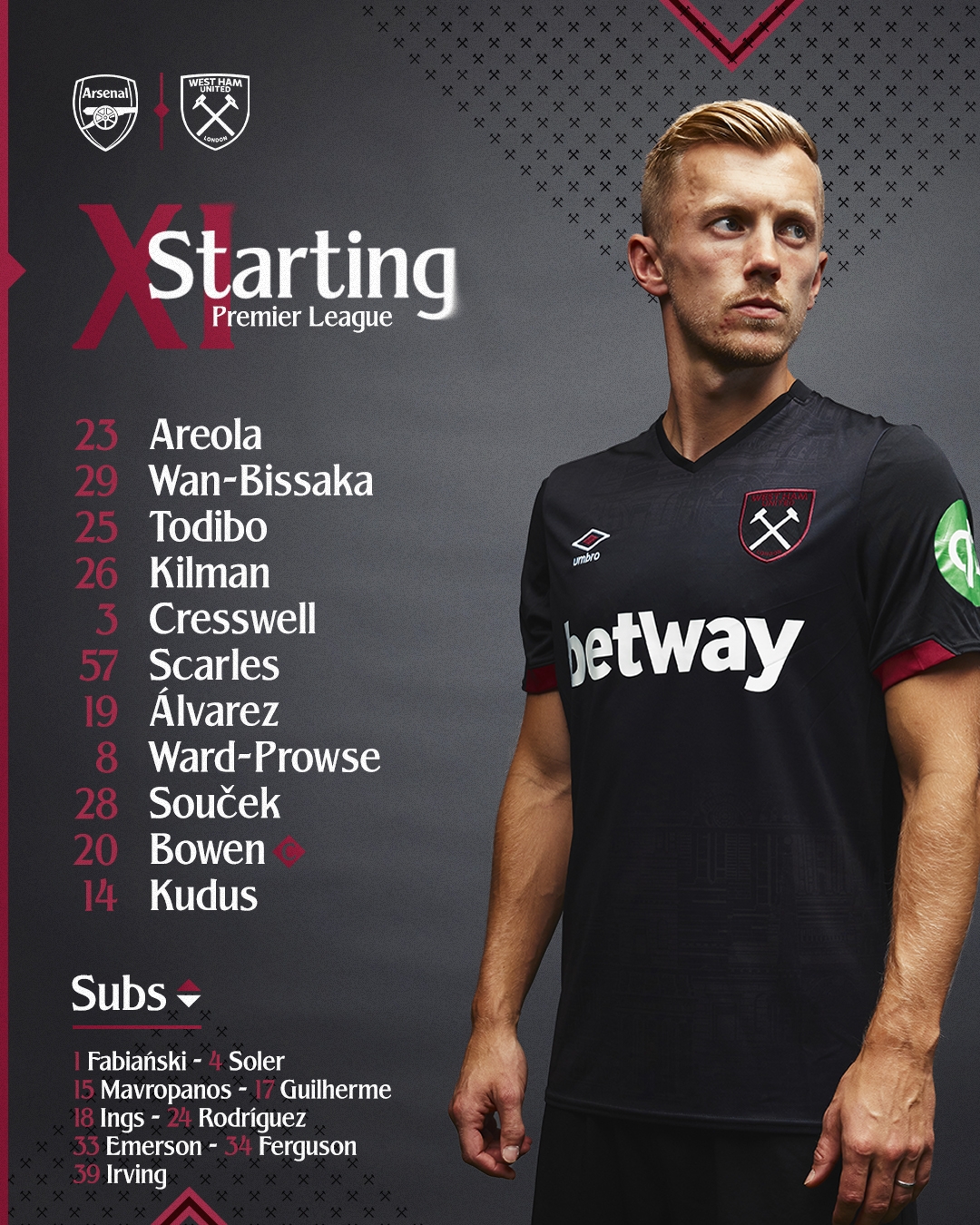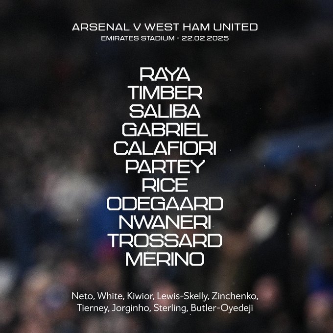 阿森納首發(fā):22-拉亞、2-薩利巴、6-加布里埃爾、12-廷伯、33-卡拉菲奧里、5-托馬斯、8-厄德高、41-賴斯、53-恩瓦內(nèi)里、19-特羅薩德、23-梅里諾