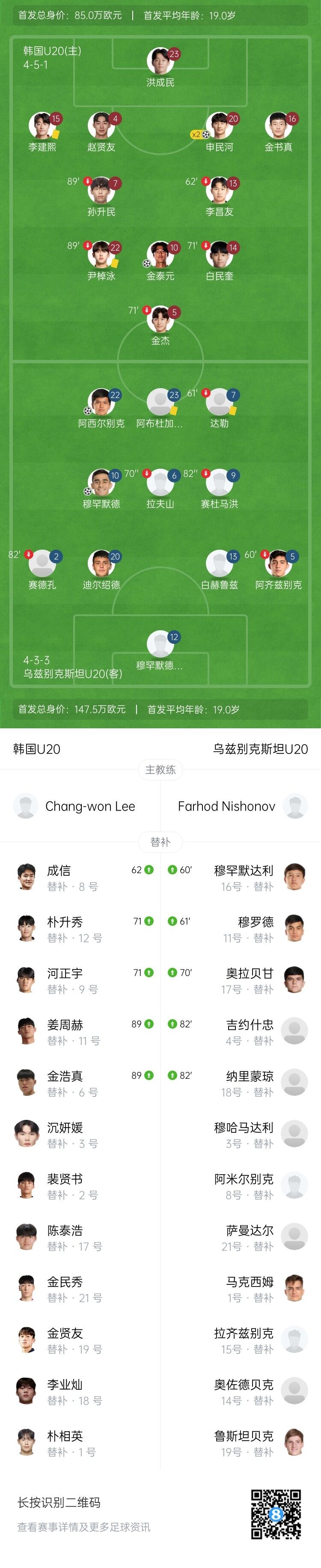 第56分鐘,韓國任意球吊到禁區(qū),申民河頭球攻門將球送進網(wǎng)窩!2-1!韓國U20反超了比分!↓