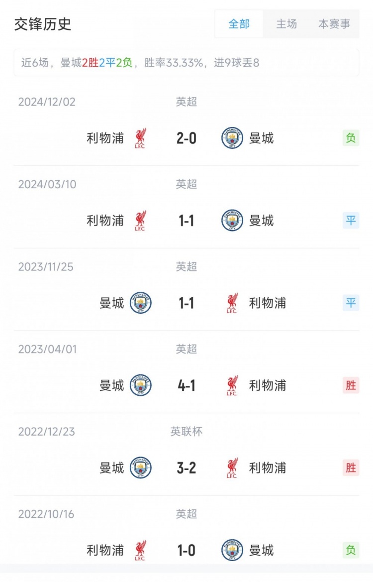 而兩隊近6次交鋒(5次英超1次聯(lián)賽杯),利物浦和曼城各取2勝,另外2場平局。在此期間,利物浦打進8球,2次零封對手,曼城打進9球,未能零封對手。