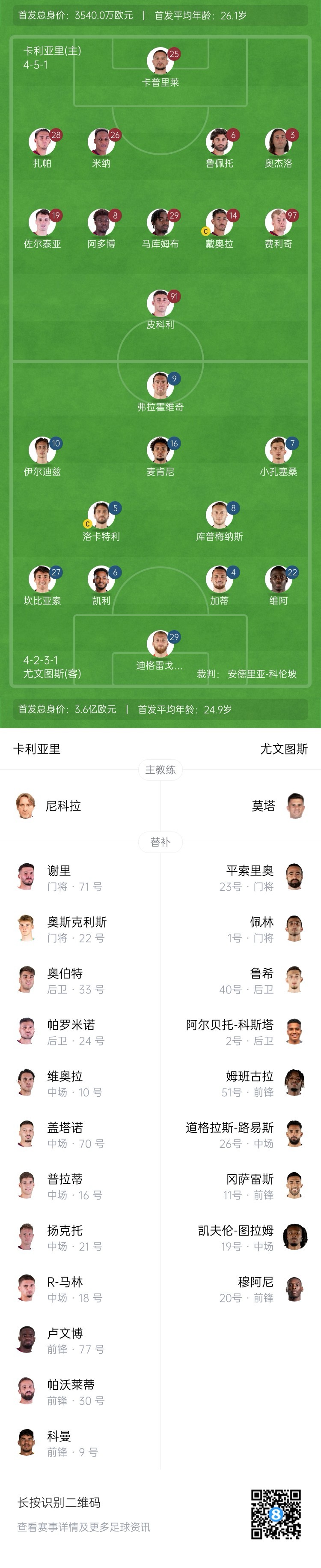 卡利亞里首發(fā):25-卡普里萊、28-扎帕、26-米納、6-魯佩托、3-奧杰洛、19-佐爾泰亞、8-阿多博、29-馬庫(kù)姆布、14-戴奧拉、97-奧利奇、91-皮科利