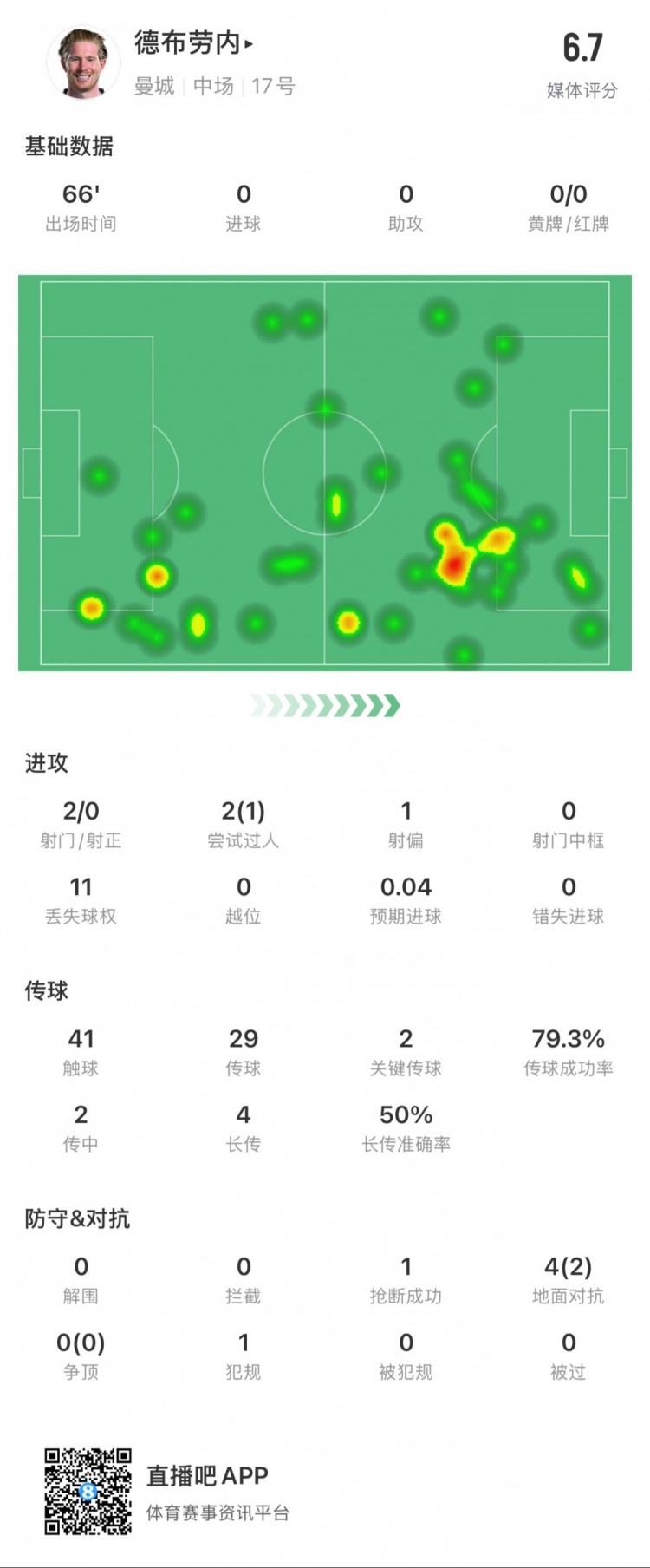 2月24日訊 本輪英超比賽,曼城對(duì)陣?yán)锲?,德布勞?nèi)本場數(shù)據(jù):