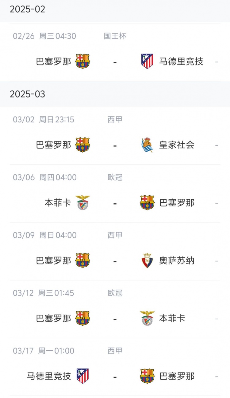 2月24日訊 未來三周,巴薩、皇馬和馬競將迎來一系列關鍵賽事。《每日體育報》報道,巴薩的賽程相對較為有利,六場比賽中將有四場主場作戰(zhàn)。