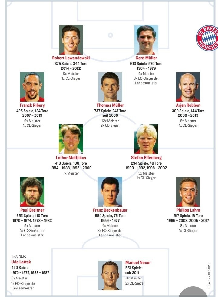 2月24日訊 拜仁迎來俱樂部成立125周年紀(jì)念,《踢球者》也評(píng)出了一套拜仁歷史最佳陣容。