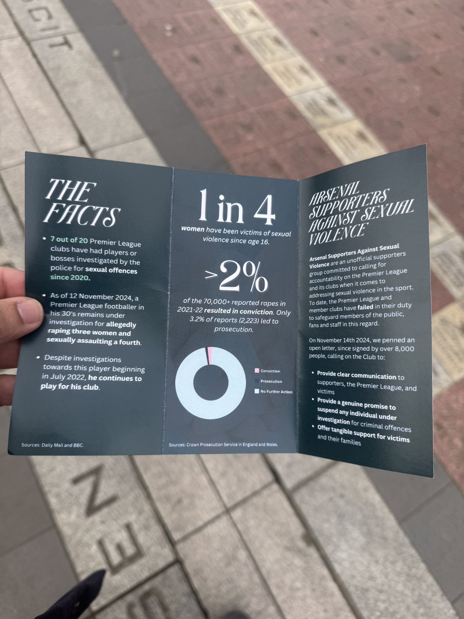 其中一頁寫道:“阿森納球迷反對性暴力組織是一個非官方的支持者團體,致力于呼吁英超聯(lián)賽及其俱樂部在解決體育運動中的性暴力問題時承擔(dān)責(zé)任。迄今為止,英超聯(lián)賽及其成員俱樂部在這方面未能盡到保護公眾、球迷和工作人員的責(zé)任?!?/p>
