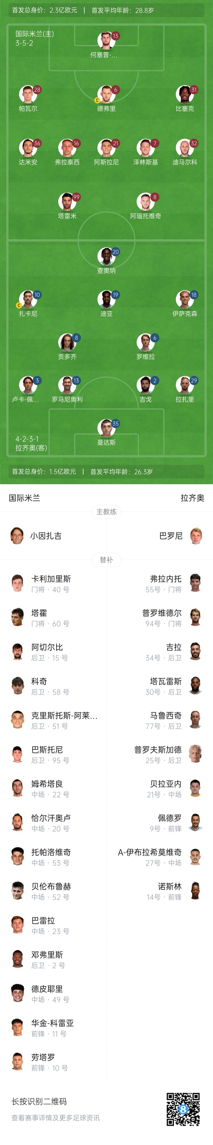 2月26日訊 意大利杯1/4決賽,國(guó)米對(duì)陣?yán)R奧,賽前首發(fā)公布。