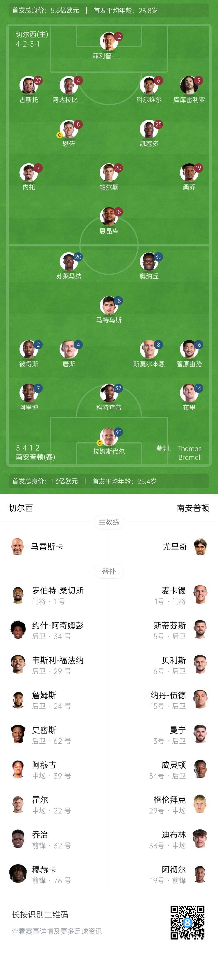 切爾西首發(fā):12-約根森、27-古斯托、4-阿達拉比奧尤、6-科爾維爾、3-庫庫雷利亞、25-凱塞多、8-恩佐、7-內(nèi)托、20-帕爾默、19-桑喬、18-恩昆庫