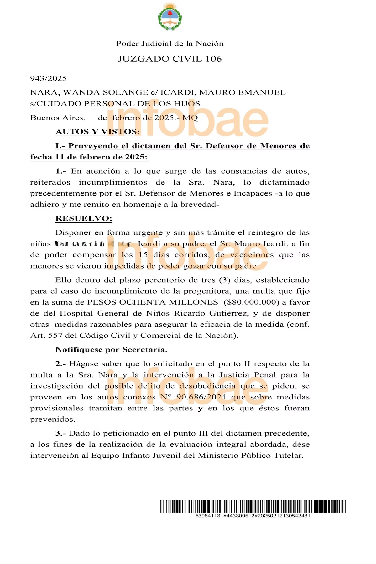 阿媒Infobae報(bào)道,法院做出了有利于伊卡爾迪的裁決,旺達(dá)需要在三天內(nèi)歸還兩個(gè)女兒,否則將面臨罰款。