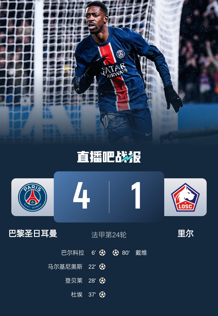 巴黎本輪4-1大勝里爾,此役后球隊(duì)10連勝,以16分優(yōu)勢領(lǐng)跑。