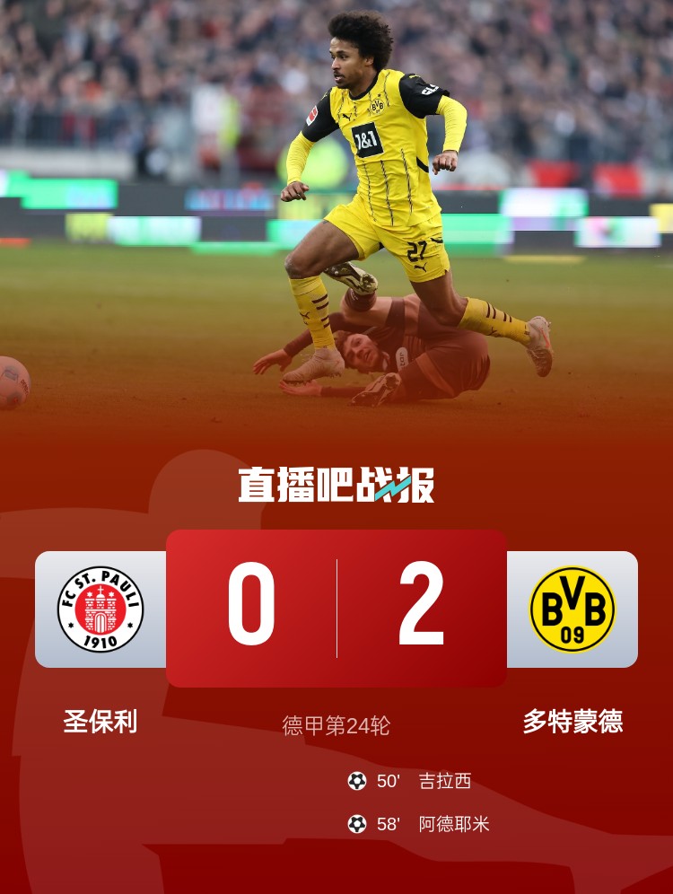多特本輪2-0擊敗圣保利,吉拉西、阿德耶米的進(jìn)球?yàn)槎嗵啬孟?分。