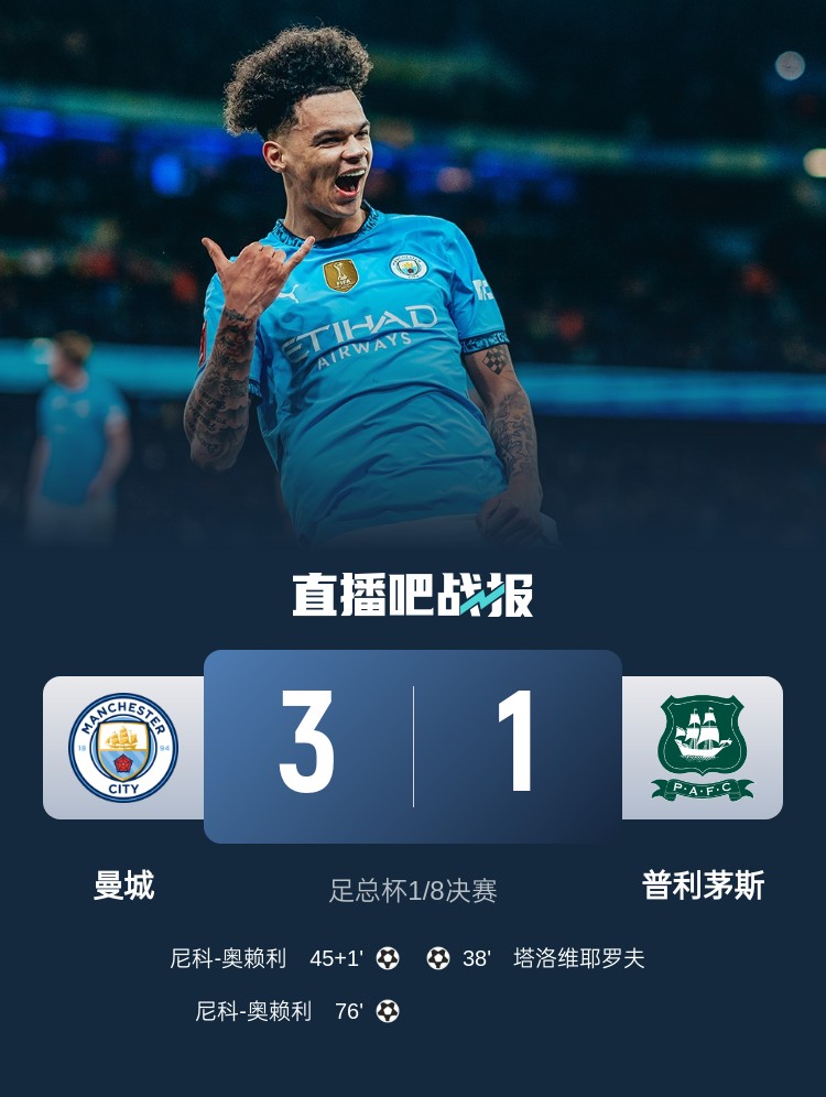 曼城足總杯3-1擊敗普利茅斯,奧賴?yán)p響建功,丁丁傳射。