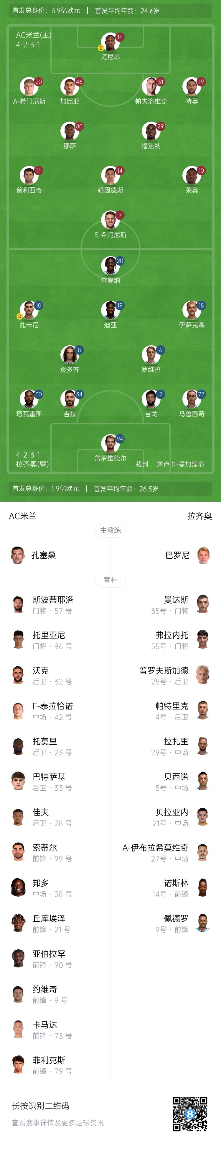 米蘭首發(fā):16-邁尼昂、20-A-希門尼斯、46-加比亞、31-帕夫洛維奇、19-特奧、80-穆薩、29-福法納、11-普利西奇、14-賴因德斯、10-萊奧、7-S-希門尼斯