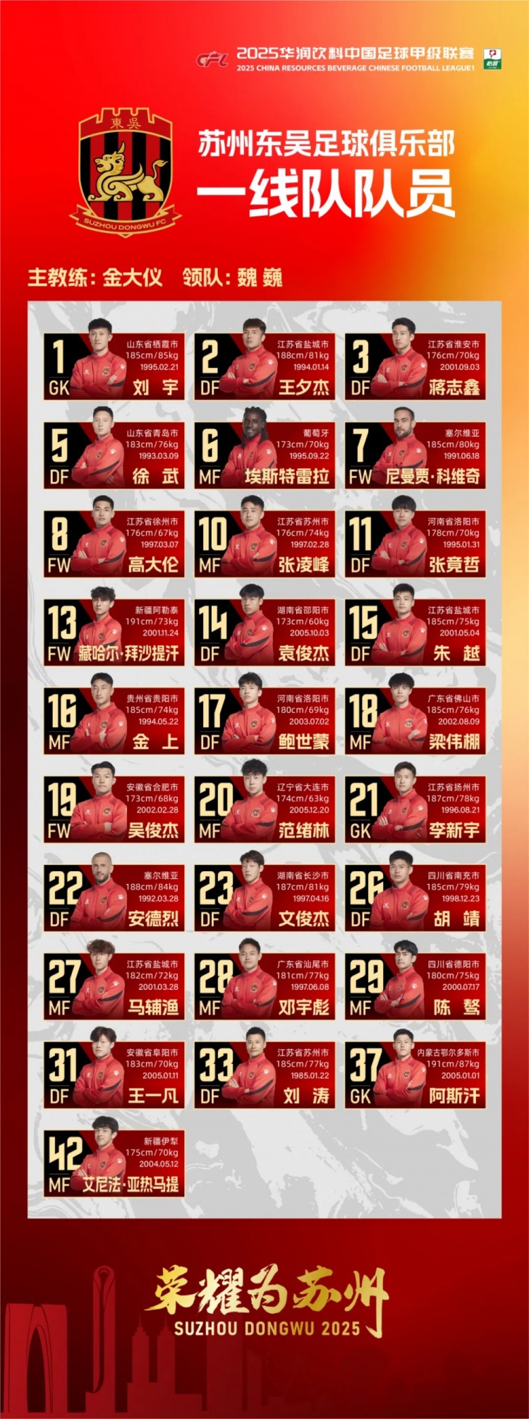2025賽季蘇州東吳一線隊(duì)大名單正式公布!