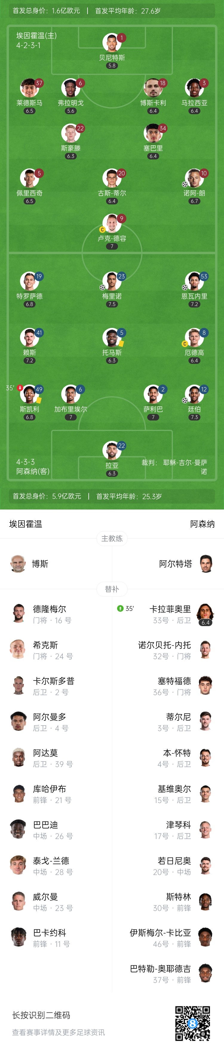 3月5日訊 北京時間4:00,歐冠1/8決賽首回合阿森納客場挑戰(zhàn)埃因霍溫,比賽在飛利浦大球場打響!上半場,廷伯頭球破門首開記錄,恩瓦內(nèi)里抽射建功;斯凱利染黃;隨后梅里諾再下一城!托馬斯送點(diǎn),諾阿-朗點(diǎn)射扳回一球。半場結(jié)束,阿森納暫時3-1領(lǐng)先埃因霍溫。