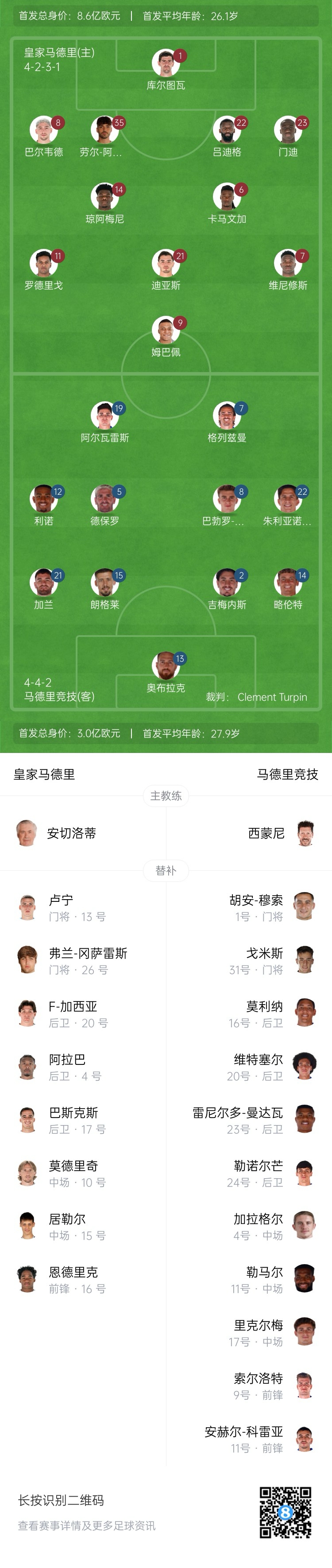 皇馬首發(fā):1-庫(kù)爾圖瓦、8-巴爾韋德、35-勞爾-阿森西奧、22-呂迪格、23-費(fèi)蘭-門(mén)迪、14-瓊阿梅尼、6-卡馬文加、11-羅德里戈、21-迪亞斯、7-維尼修斯、9-姆巴佩
