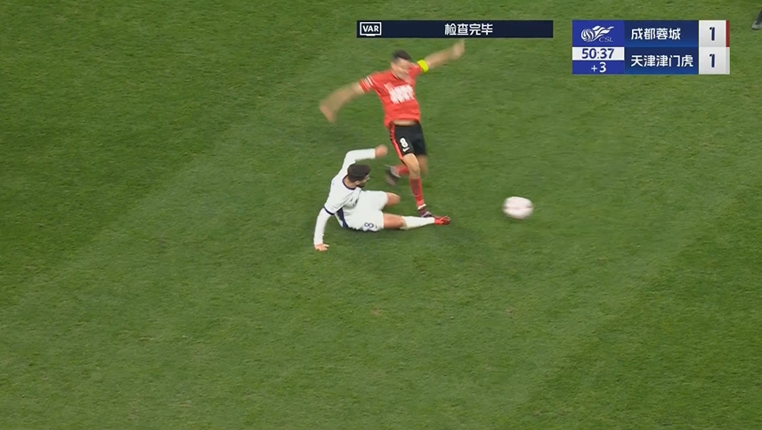 【判例二】:中超聯(lián)賽第2輪,成都蓉城VS天津津門虎,比賽第45+3分鐘,成都蓉城8號隊(duì)員在爭搶球時疑似踩踏天津津門虎8號隊(duì)員,裁判員未判罰犯規(guī),VAR介入,裁判員經(jīng)在場回看后,判罰成都蓉城8號隊(duì)員嚴(yán)重犯規(guī),并向其出示紅牌罰令出場。