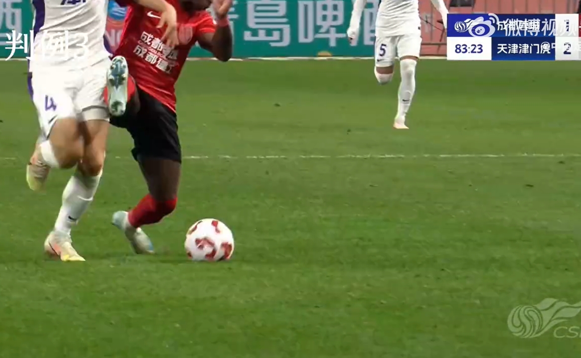 【判例三】:中超聯(lián)賽第2輪,成都蓉城VS天津津門虎,比賽第84分鐘,天津津門虎4號隊(duì)員在爭搶球時疑似踩踏成都蓉城47號隊(duì)員,裁判員判罰天津津門虎4號犯規(guī),未出示紅黃牌,VAR未介入。