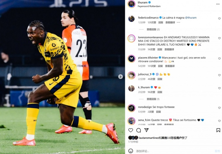 3月6日訊 在本輪歐冠,國米客場2-0擊敗費(fèi)耶諾德。本場比賽勞塔羅與小圖拉姆雙雙破門,賽后兩人也分別在個(gè)人社媒曬出本場進(jìn)球后怒吼慶祝的照片。 標(biāo)簽: 足球 意甲 國際米蘭