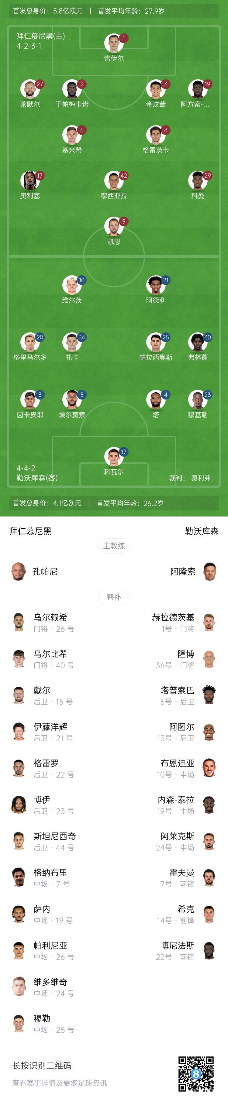 3月6日訊 歐冠1/8決賽首回合,拜仁主場對陣勒沃庫森。賽前,官方公布了本場的首發(fā)名單。