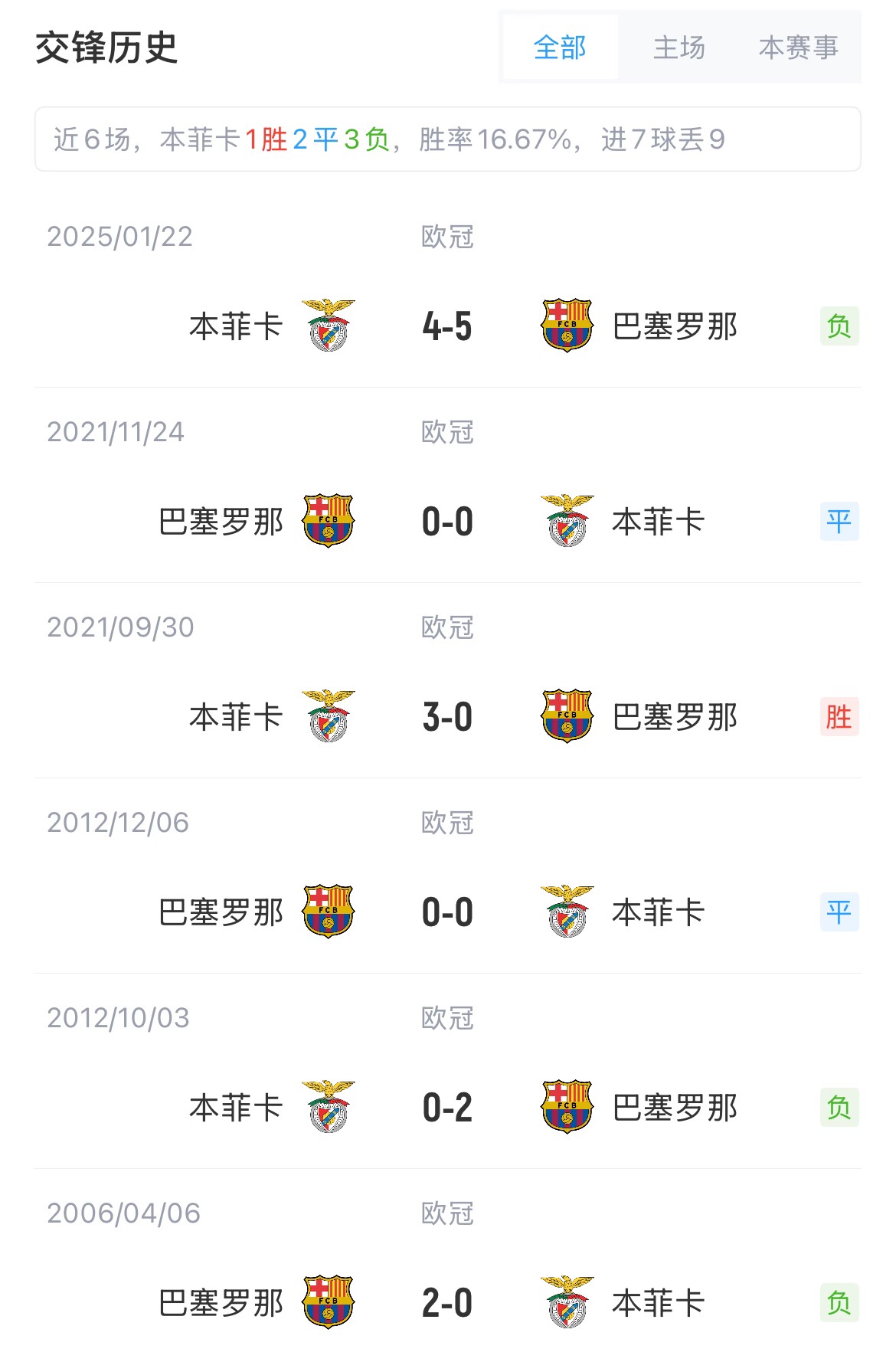 巴薩與本菲卡歷史共交手10次,巴薩4勝4平2負(fù)。兩隊(duì)本賽季歐冠聯(lián)賽階段同組,巴薩客場5-4絕殺本菲卡。