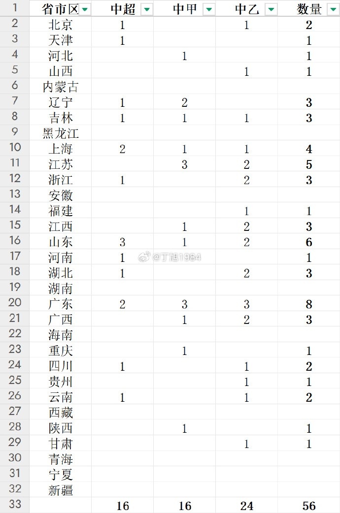 3月6日訊 據(jù)記者丁旭統(tǒng)計,新賽季中國三級職業(yè)聯(lián)賽共有56支球隊,擁有8支球隊的廣東省成為擁有職業(yè)球隊最多的省市區(qū)。