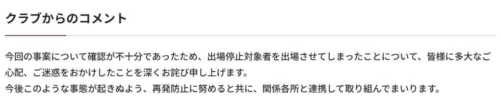 處罰公告發(fā)出后,廣島三箭俱樂部也發(fā)布聲明確認(rèn)該處罰,并且也回應(yīng)了一則簡(jiǎn)短的聲明。