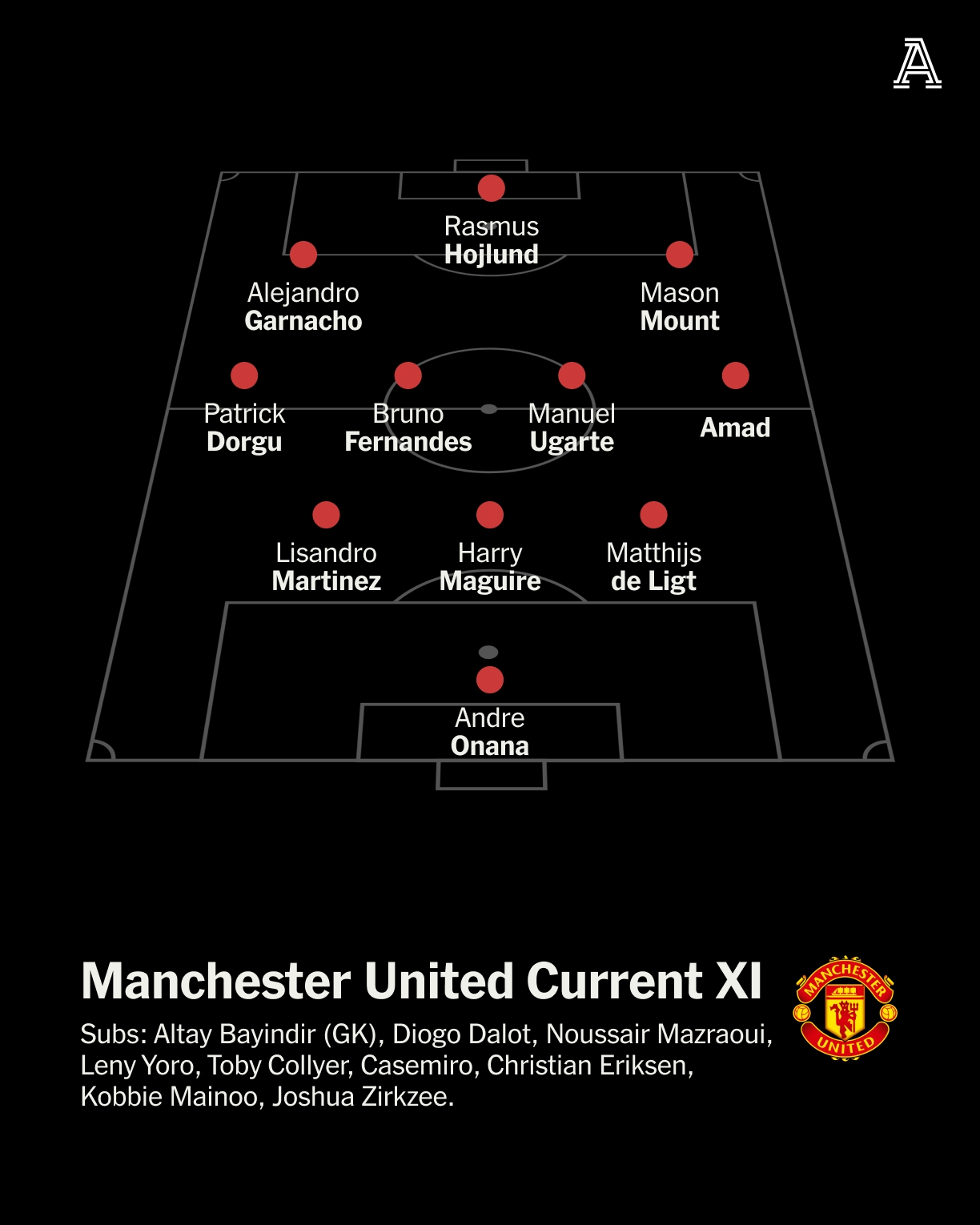 曼聯(lián)現(xiàn)役首發(fā):奧納納;利馬、馬奎爾、德里赫特;多古、B費(fèi)、烏加特、阿瑪?shù)拢患蛹{喬、霍伊倫、芒特