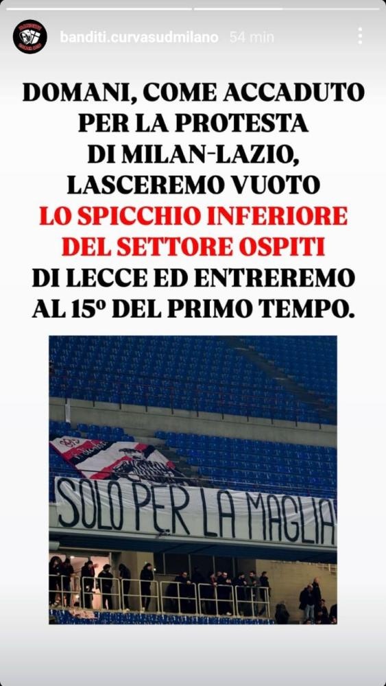米蘭南看臺球迷組織在社交平臺上宣布:“明天,就像米蘭-拉齊奧時發(fā)生的抗議一樣,我們將會在萊切球場客隊坐區(qū)制造一片空場,我們將會從上半場第15分鐘再進場。”