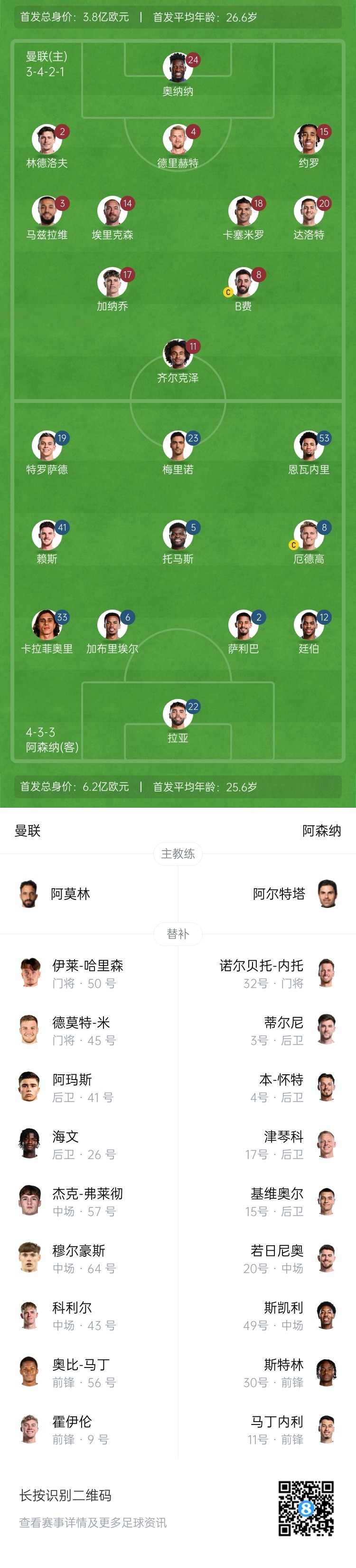 曼聯(lián)首發(fā):24-奧納納、2-林德洛夫、4-德里赫特、15-約羅、3-馬茲拉維、20-達(dá)洛特、14-埃里克森、18-卡塞米羅、8-B費(fèi)、17-加納喬、11-齊爾克澤