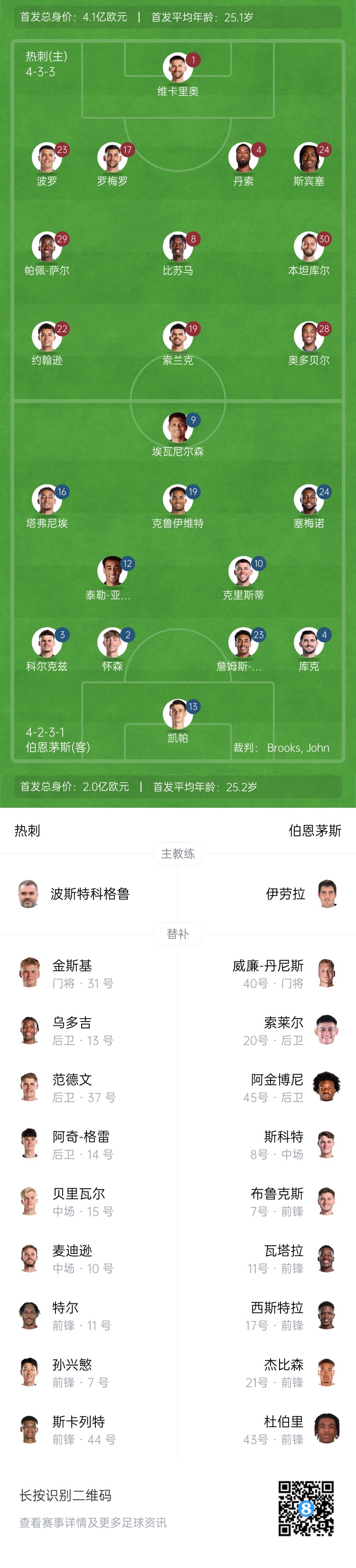 熱刺首發(fā):1-維卡里奧、23-波羅、17-羅梅羅、4-丹索、24-斯賓塞、30-本坦庫(kù)爾、8-比蘇馬、29-佩普-薩爾、22-布倫南-約翰遜、19-索蘭克、28-奧多貝爾