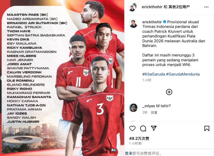 3月9日訊 今日,印尼足協(xié)主席托希爾更新社媒,曬出了印尼國家隊3月份18強賽大名單,迪克斯、伊澤斯、哈耶、帕斯、小賴因德斯、費爾東克等歸化球員悉數(shù)入選。