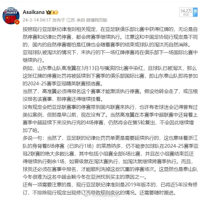 而亞足聯(lián)則相反,紅牌自然停賽需要跨賽季執(zhí)行?,F(xiàn)中足聯(lián)和中國足協(xié)已經(jīng)分家,中足聯(lián)目前還是和中國足協(xié)保持一致,如果中足聯(lián)日后出臺與之不同的新的停賽執(zhí)行細(xì)則,職業(yè)聯(lián)賽范疇內(nèi)當(dāng)然也是要以中足聯(lián)的規(guī)定為準(zhǔn)。