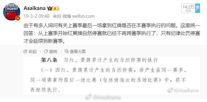 從2018賽季起,中國足協(xié)賽事的自然停賽隨賽季結(jié)束自動(dòng)消除(此前是紅牌自然停賽或紀(jì)律處罰需要跨賽季)